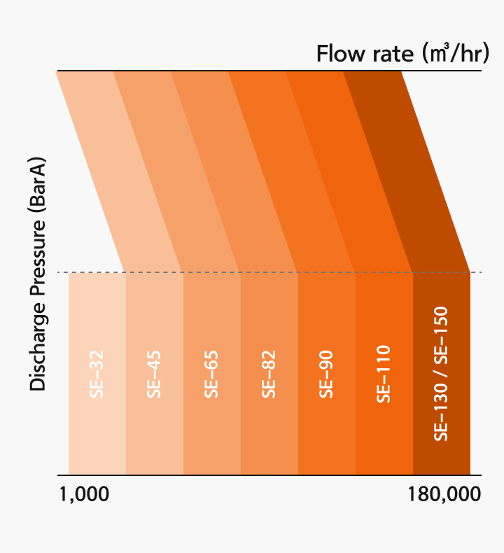 Our compressors feature a broad product lineup handling flow rates up to 180,000 ㎥/hr, flexibly meeting diverse customer flow requirements.